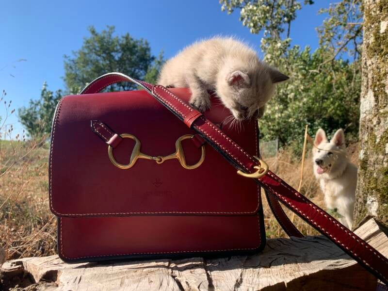 Taillé dans un sublime cuir pleine fleur à tannage végétal rouge, doublé veau, le sac "Bathsheba" se veut résolumment chic et moderne. Orné d'un mors en laiton, il possède une petite poche intérieure format grand téléphone. Entièrement cousu à la main point par point au fil de lin.