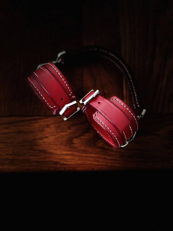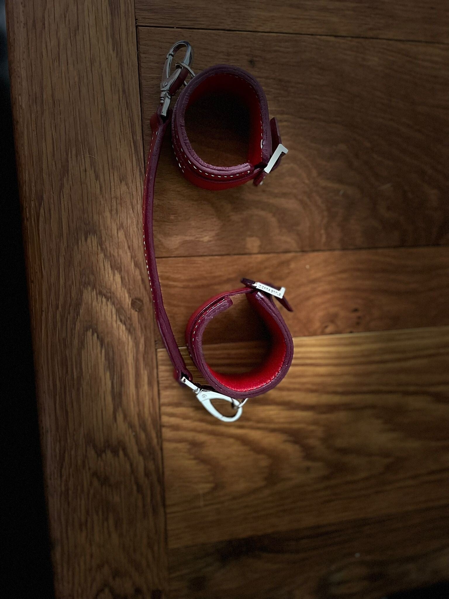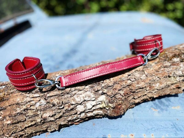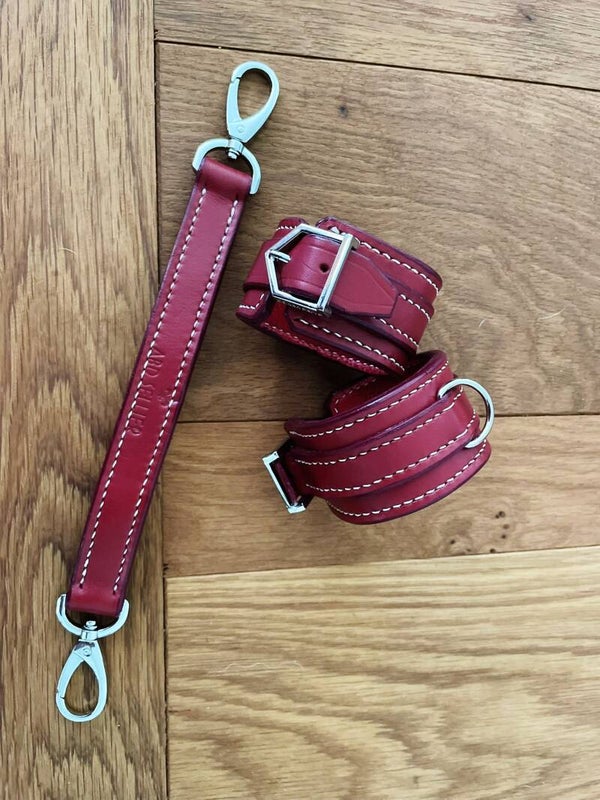 Menottes en cuir de bovin pleine fleur à tannage végétal, doublées veau et entièerement cousu à la main au fil de lin.