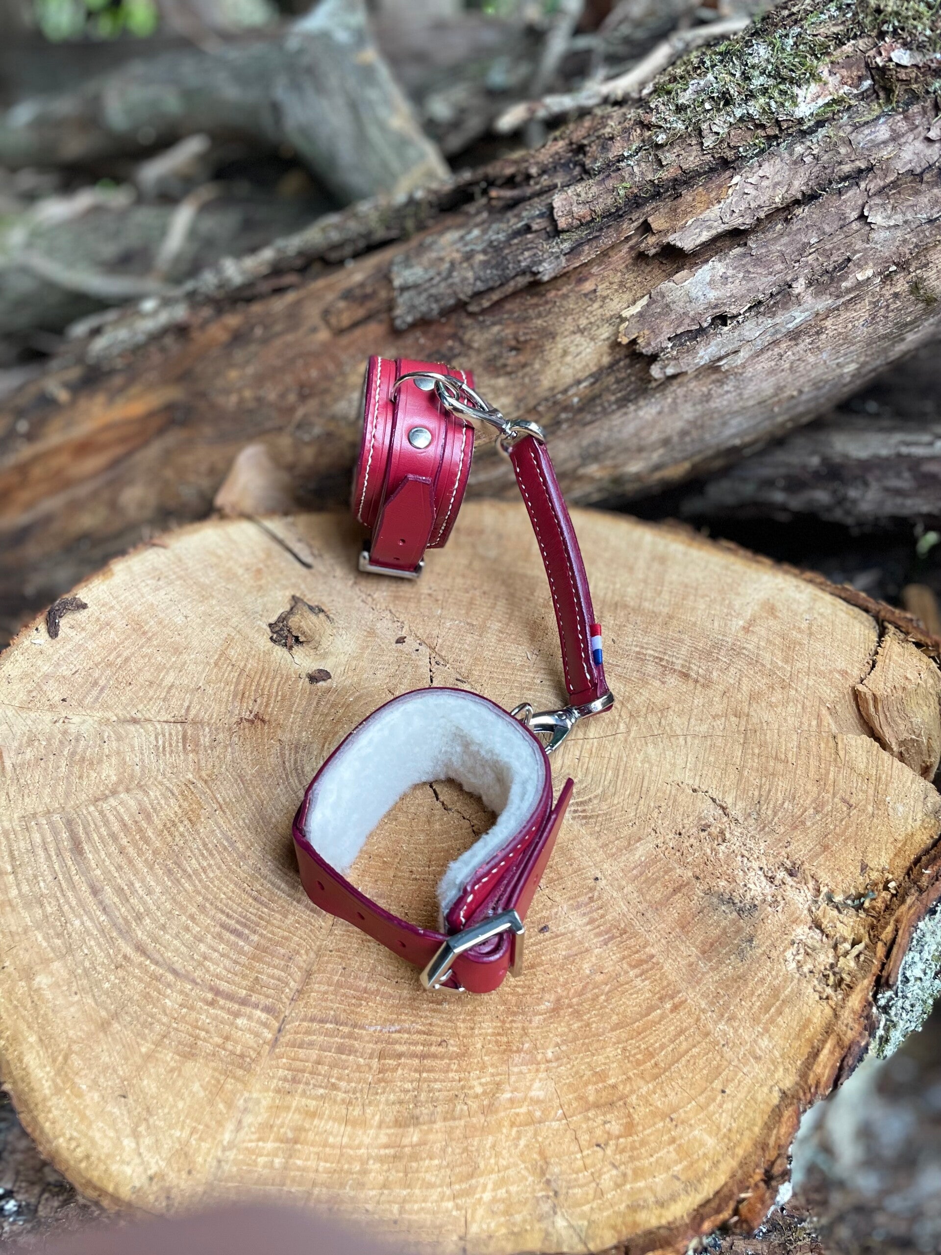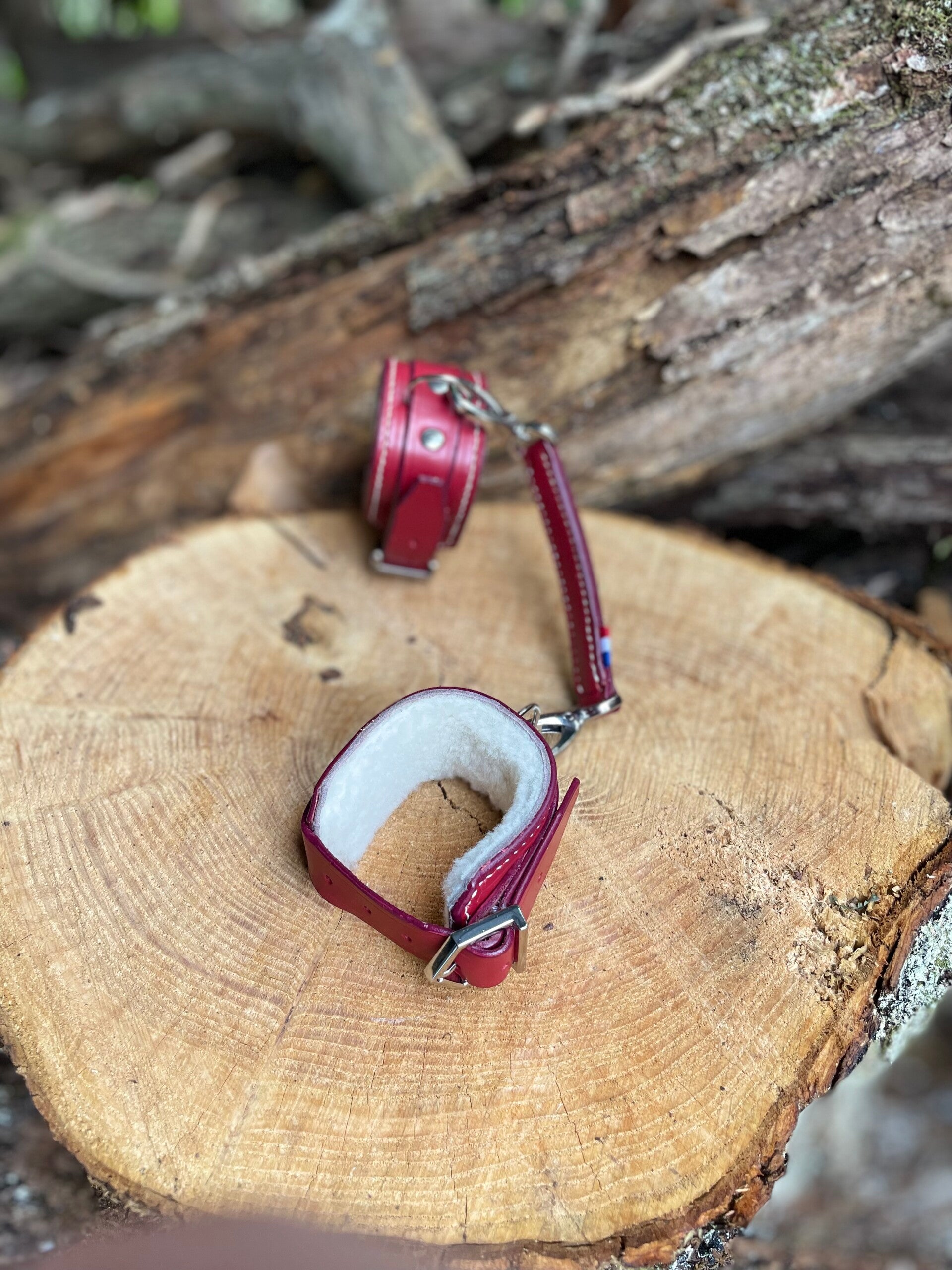 Menottes en cuir de bovin pleine fleur à tannage végétal, doublées mouton véritable et entièrement cousues à la main au fil de lin.