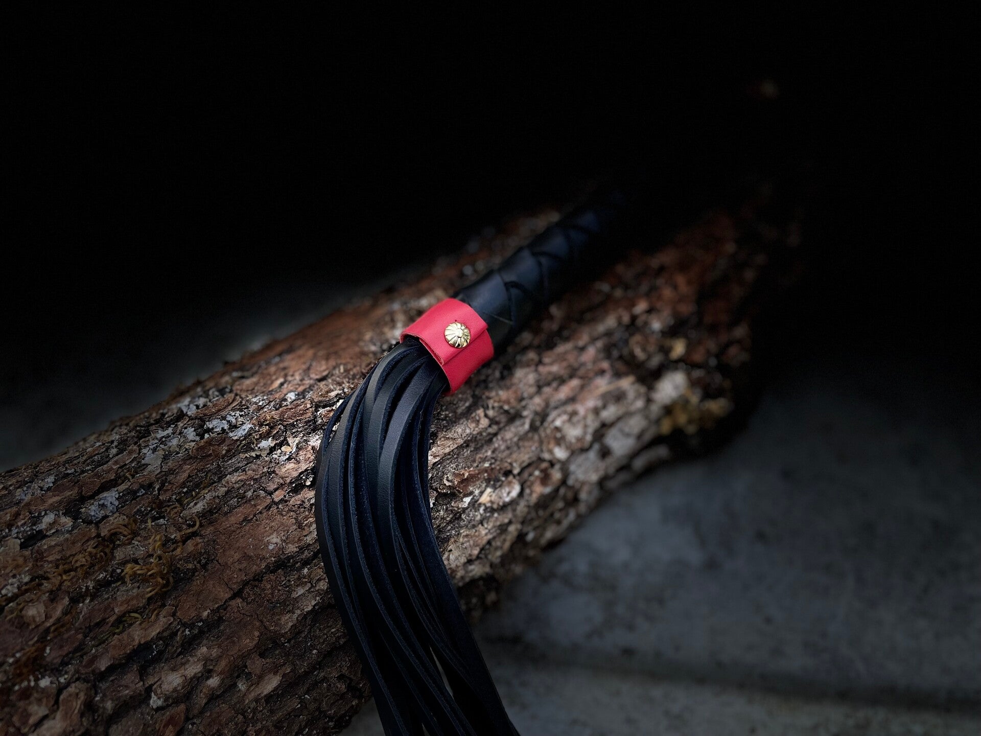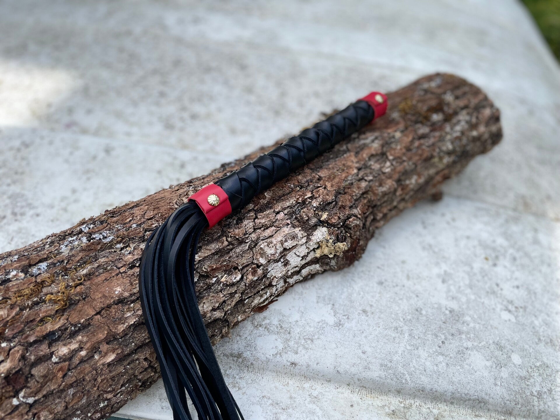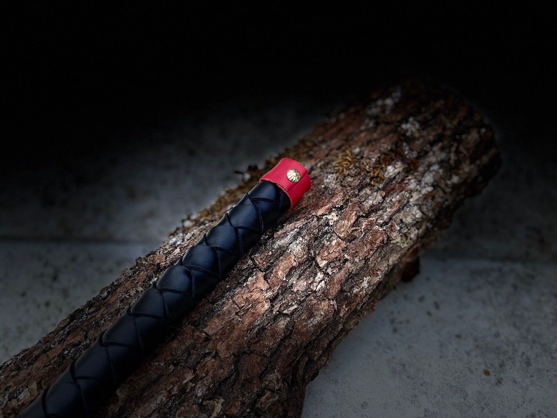 Martinet en bois de hêtre, recouvert de cuir pleine fleur. Tressage à la main, détails raffinés. Frange en cuir pleine fleur. Longueur manche :20 cm.