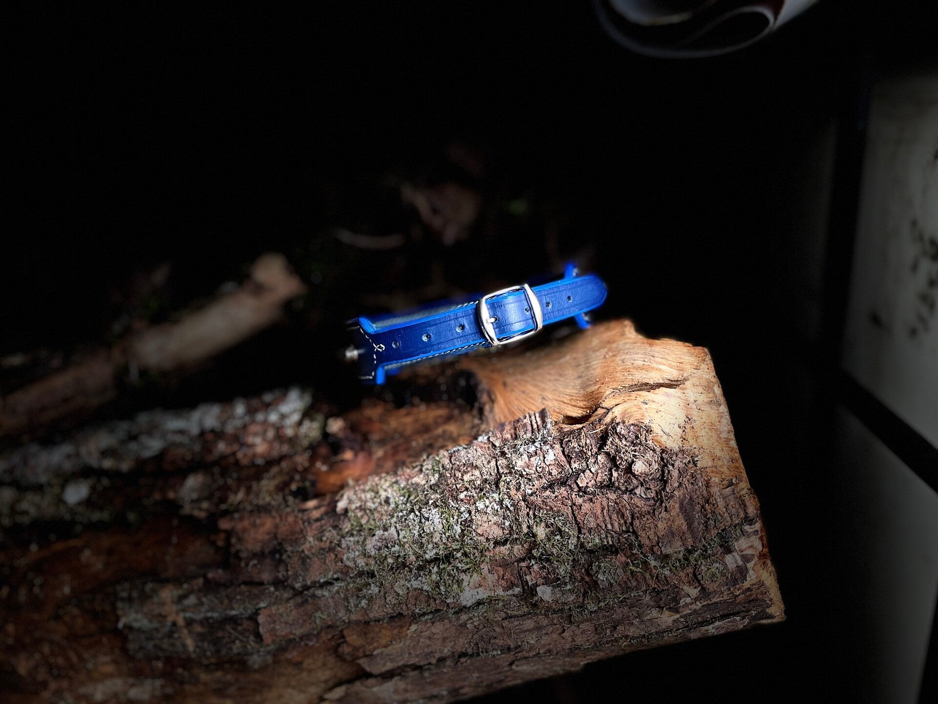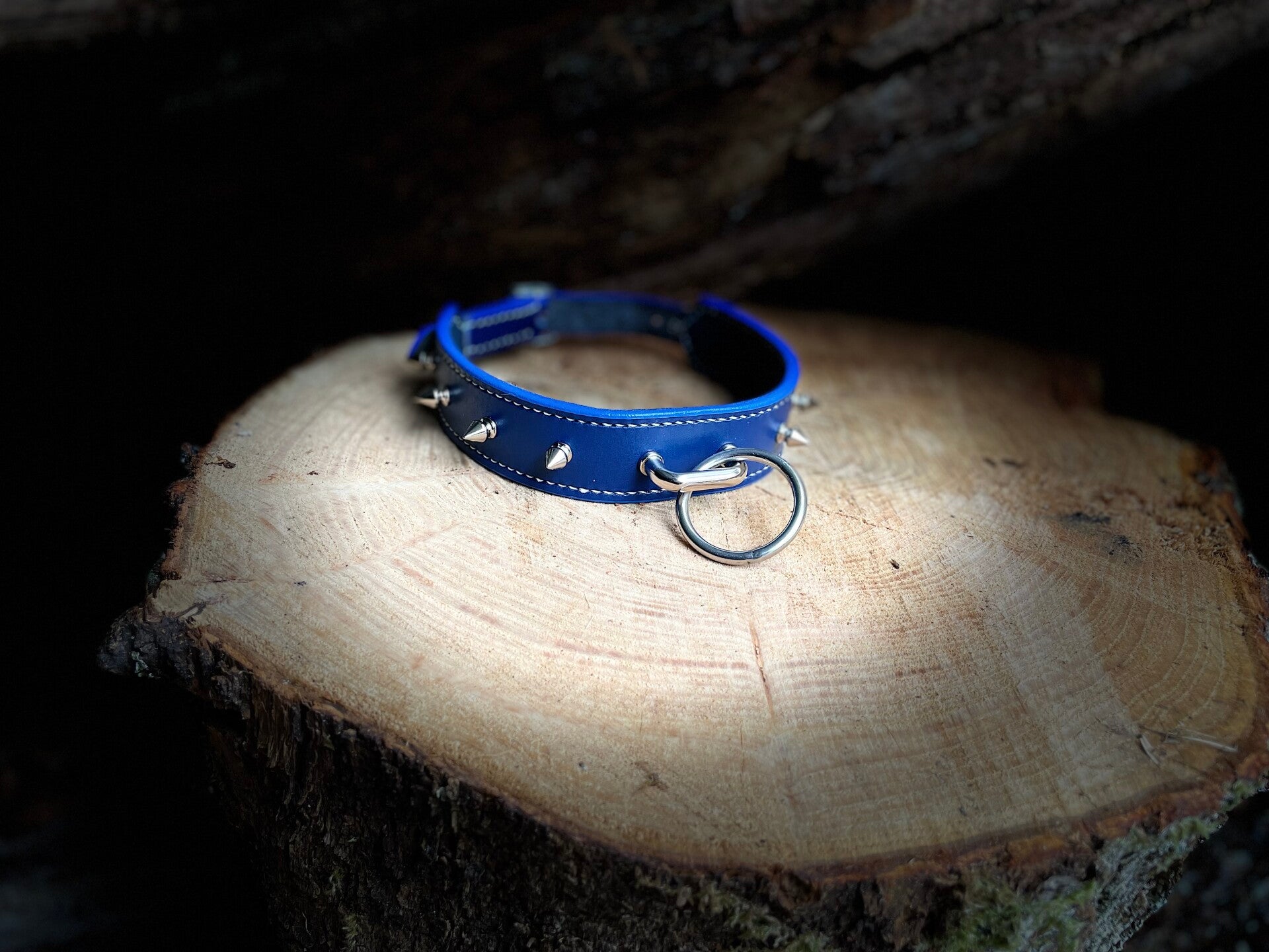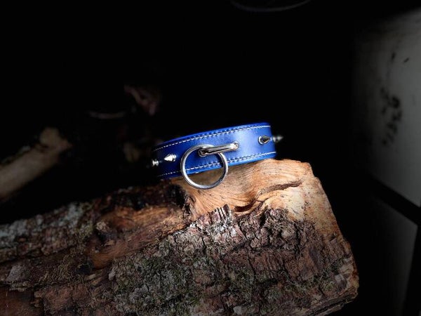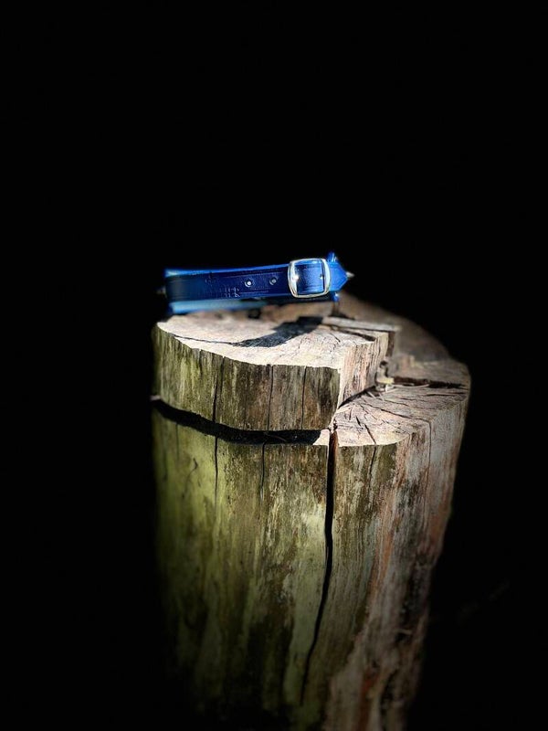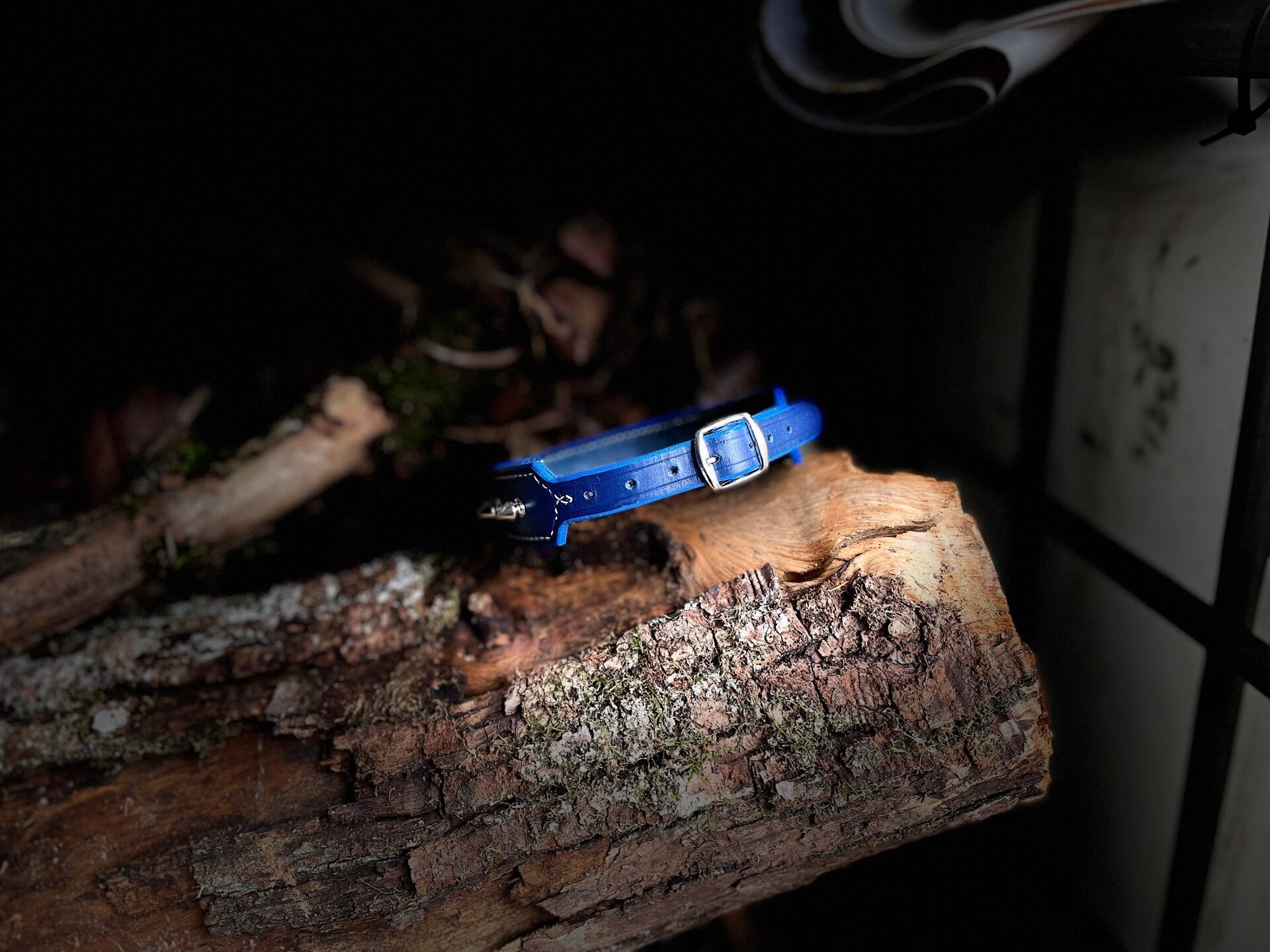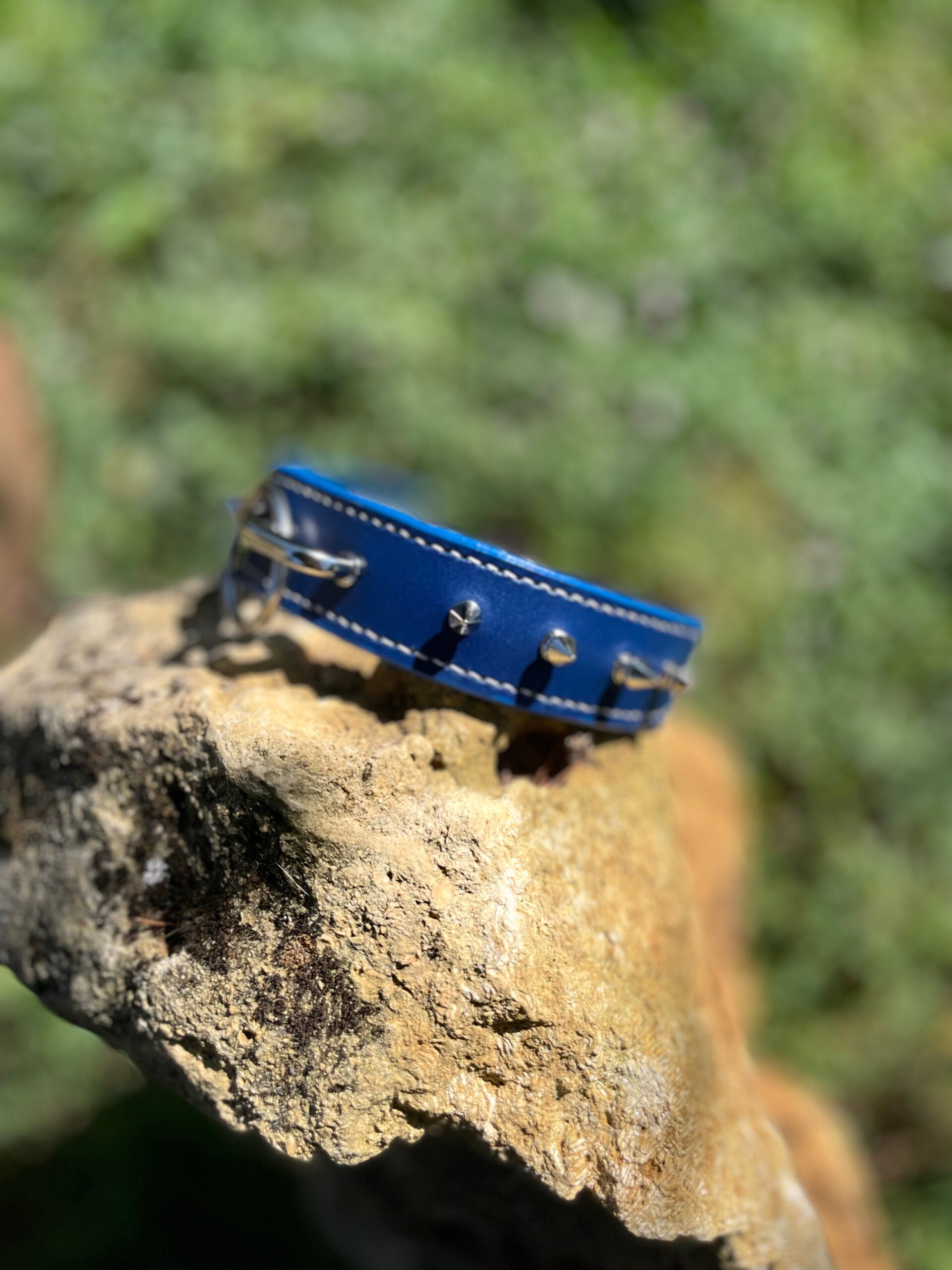 Collier bleu, à clous argentés. Cuir bleu pleine fleur doublé veau pour le confort. Boucle argentée. Largeur 30 mm au plus large.