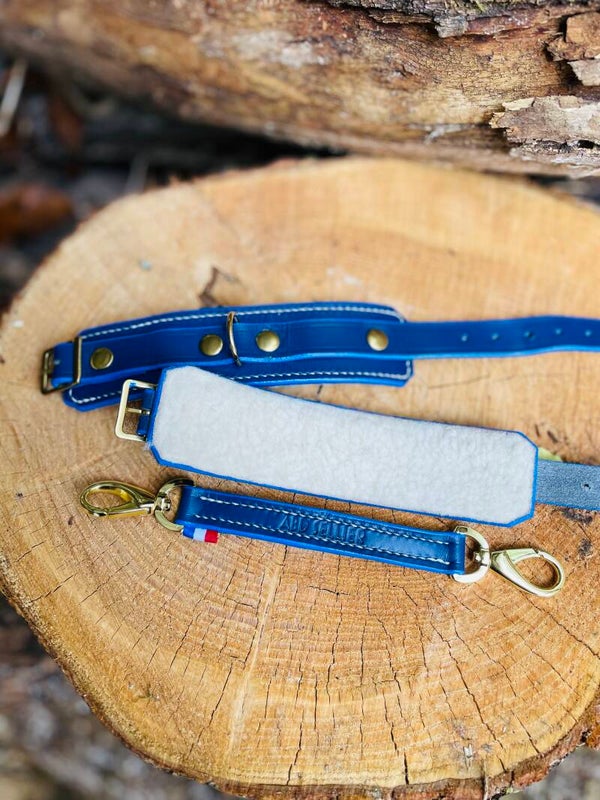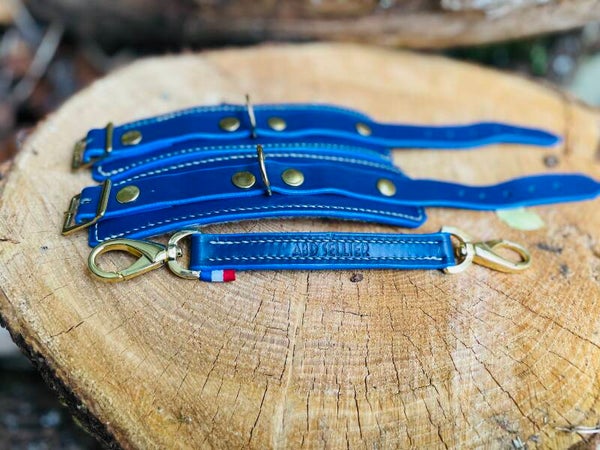 Boucles dorées. Lien en cuir à mousquetons tournant.