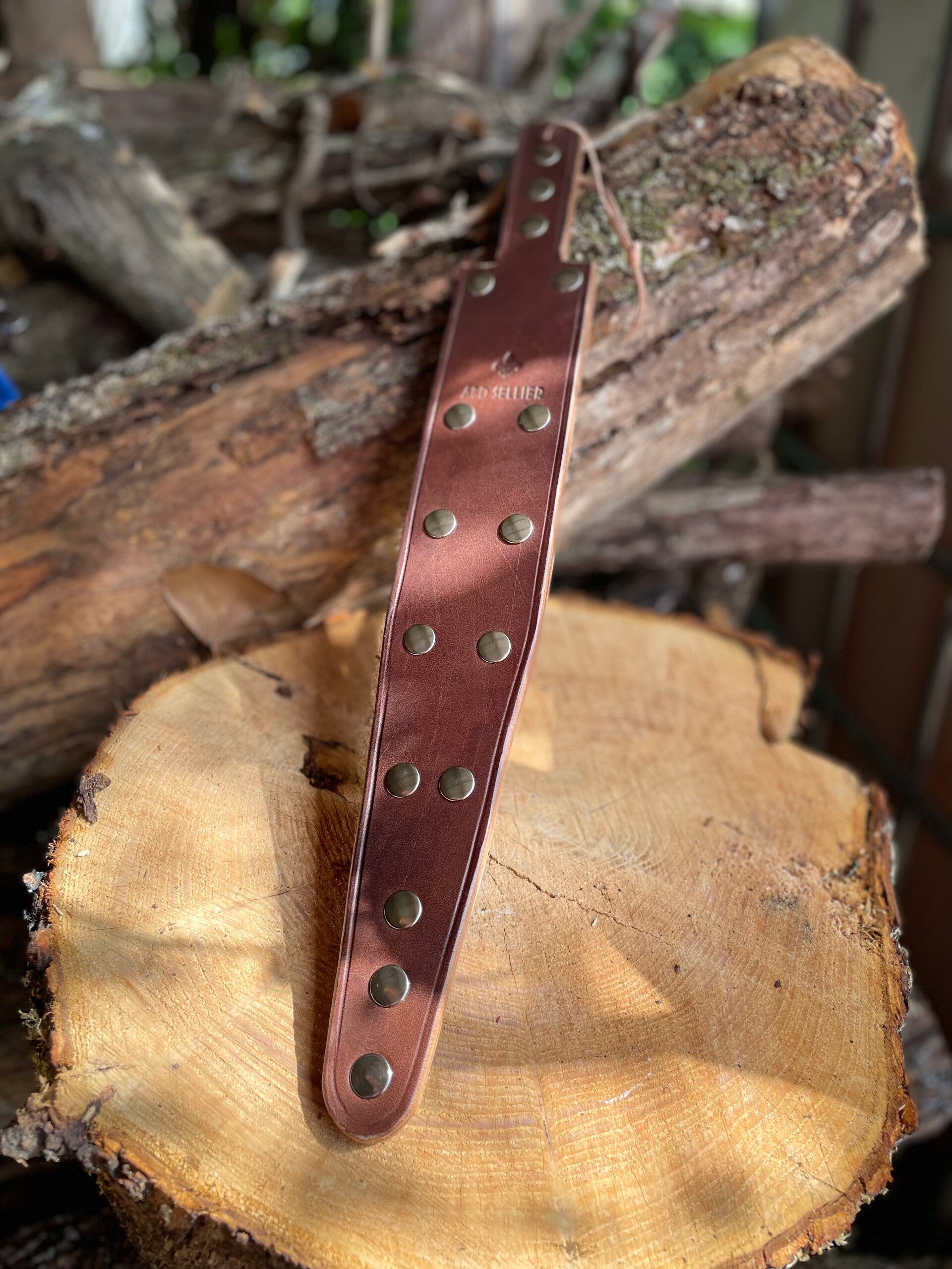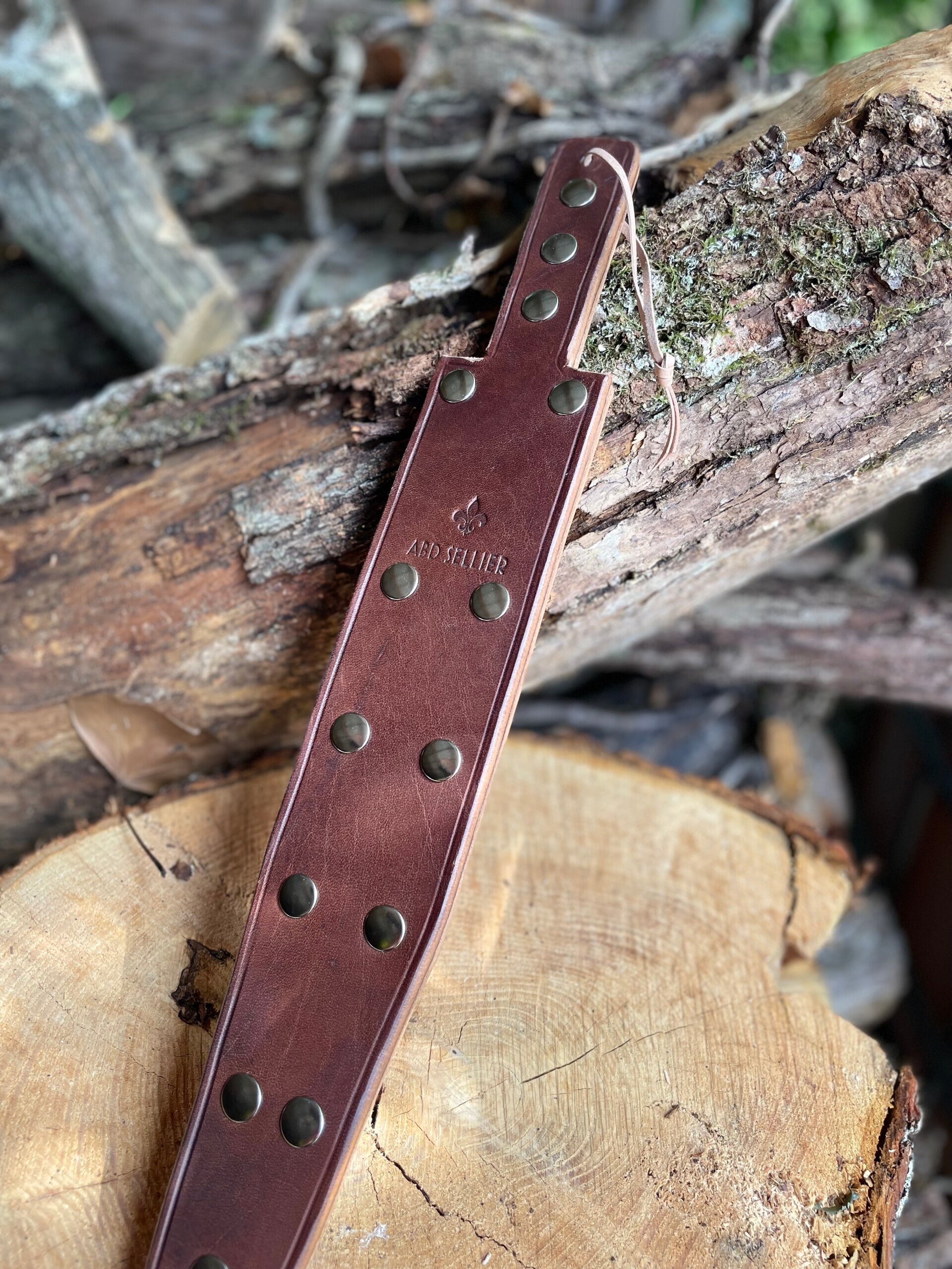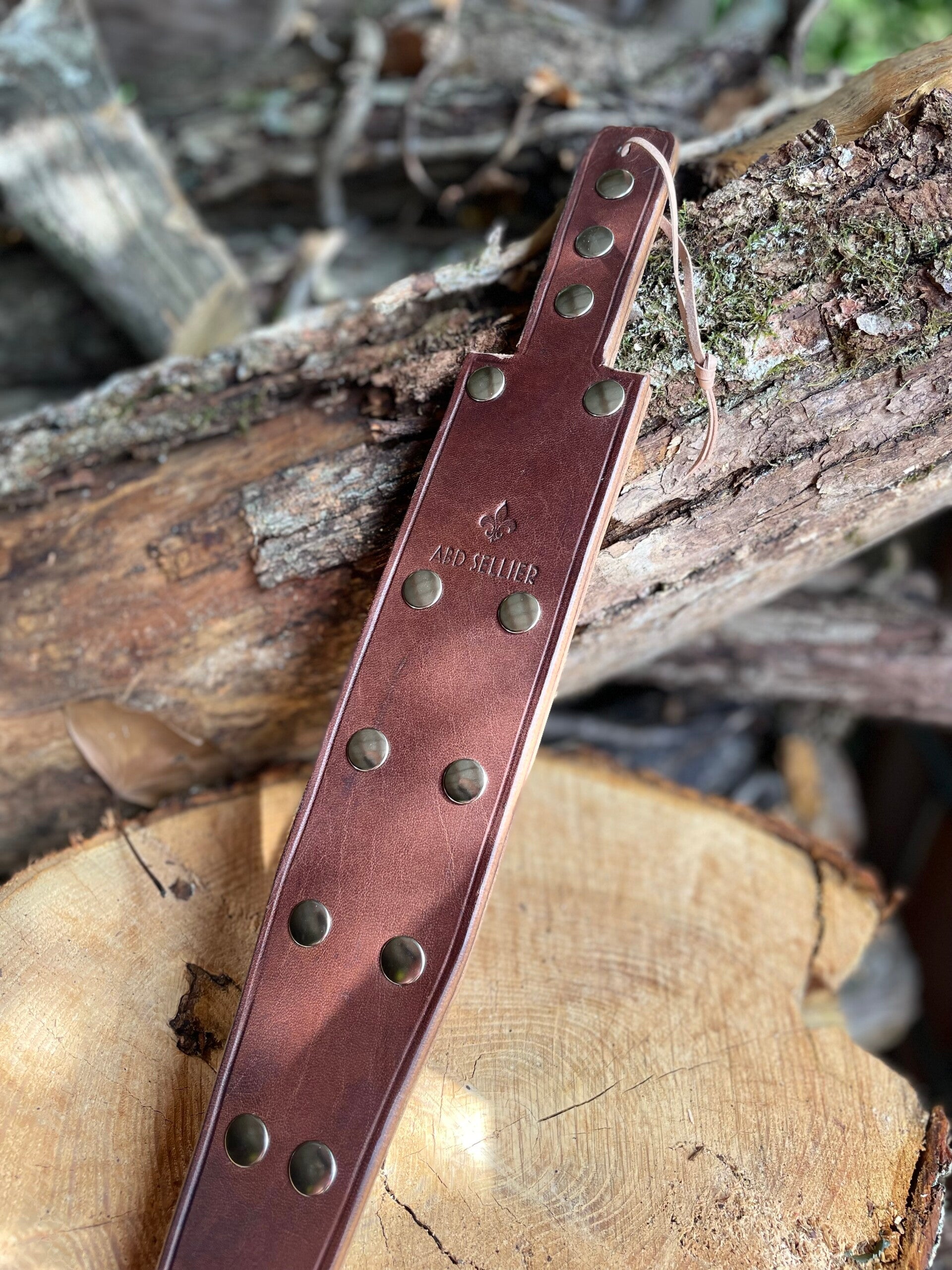 Paddle à haute densité. Environ 1 cm d'épaisseur. Doublé et riveté (rivers argentés), fabriqué à partir de cuir à tannage végétal très ferme avec une excellente tenue.