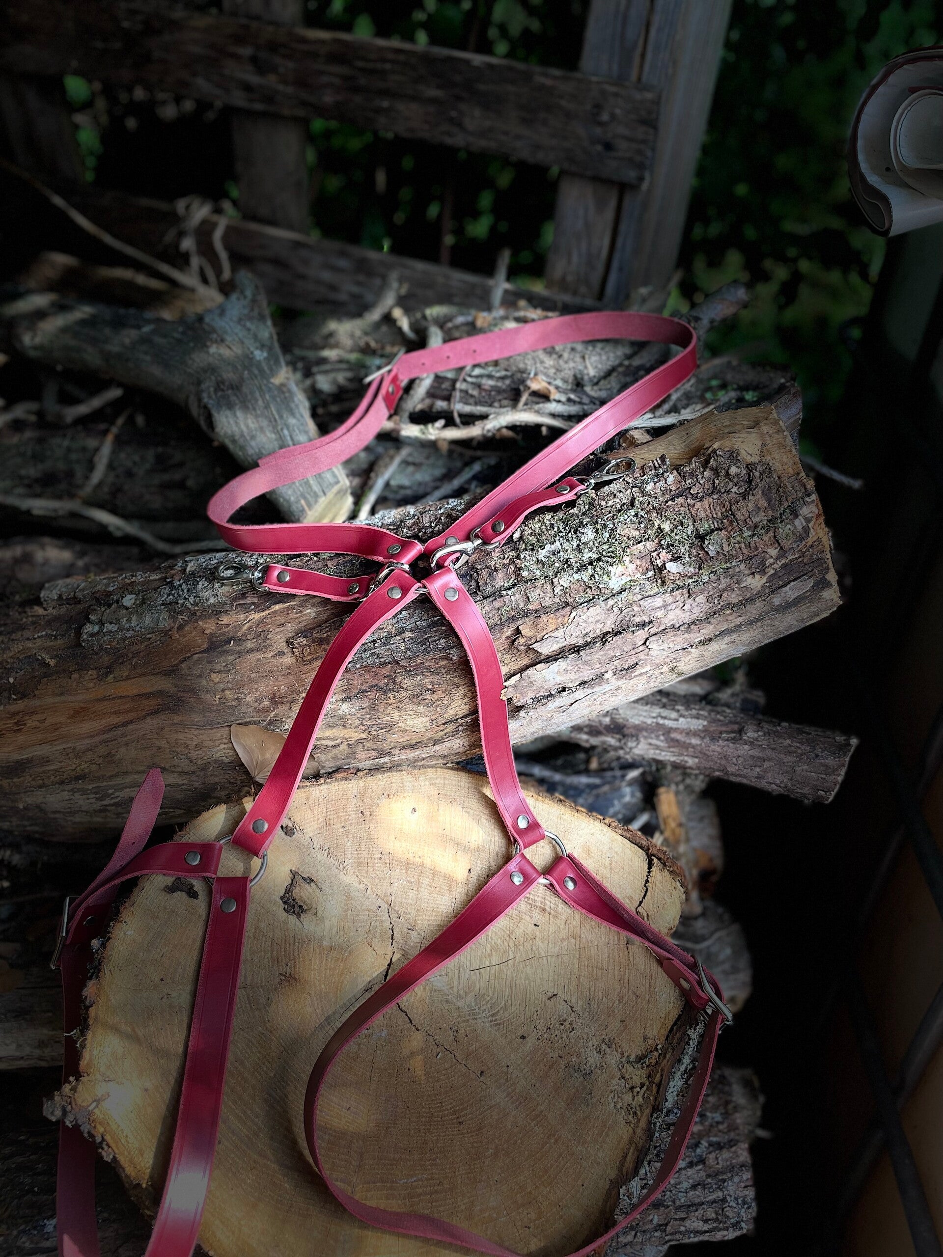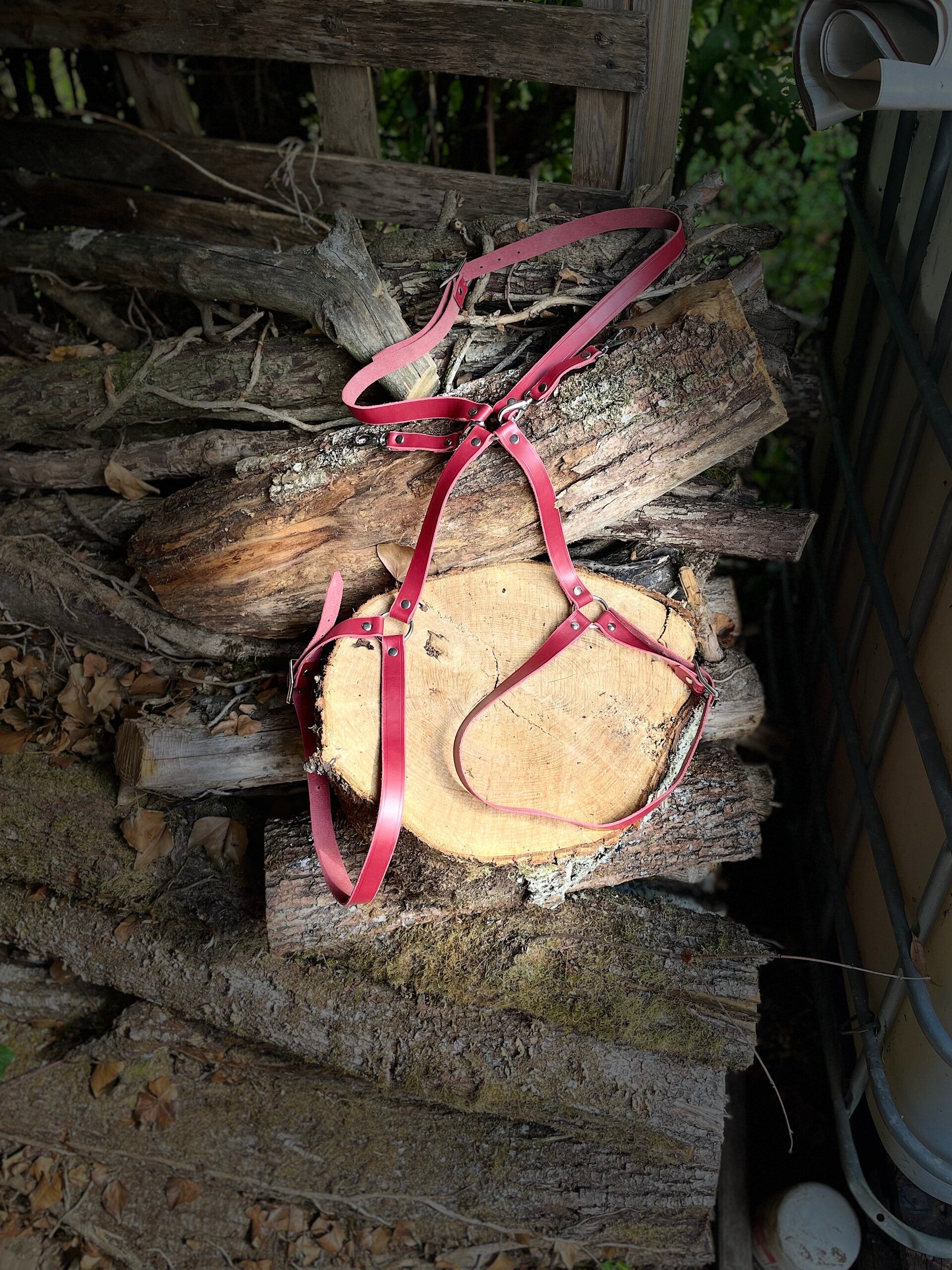 Harnais bas du corps, jarretière et mousquetons d'attache pour les menottes de la même gamme disponibles sur la boutique.
