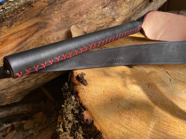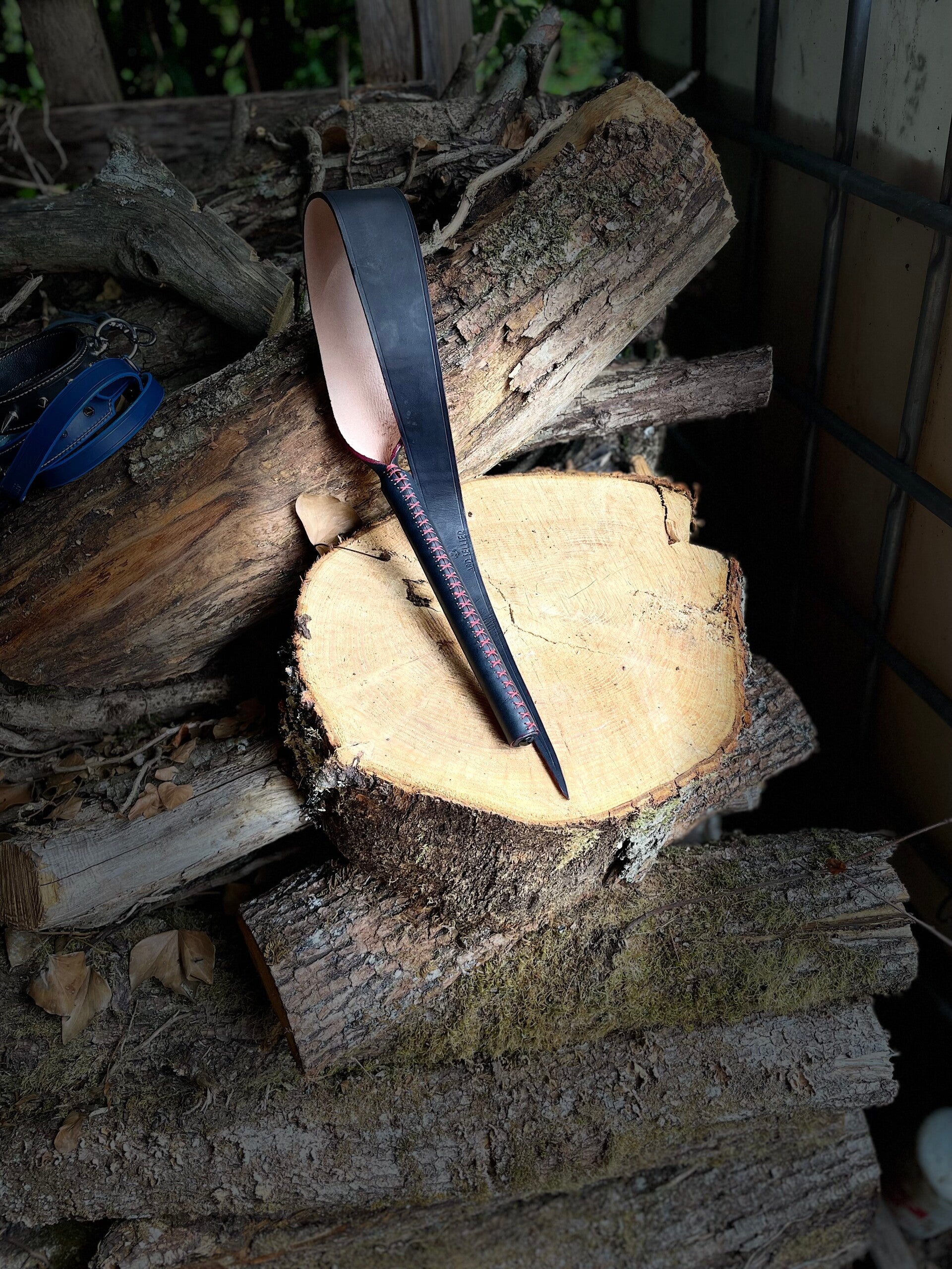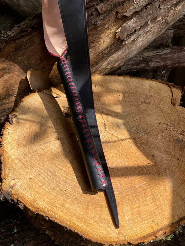 Redoutable, cette langue du Diable peut infliger de cinglants contacts. Manche en bois de hêtre gainé de cuir à tannage végétal, français. Longueur 1 m environ tout compris.