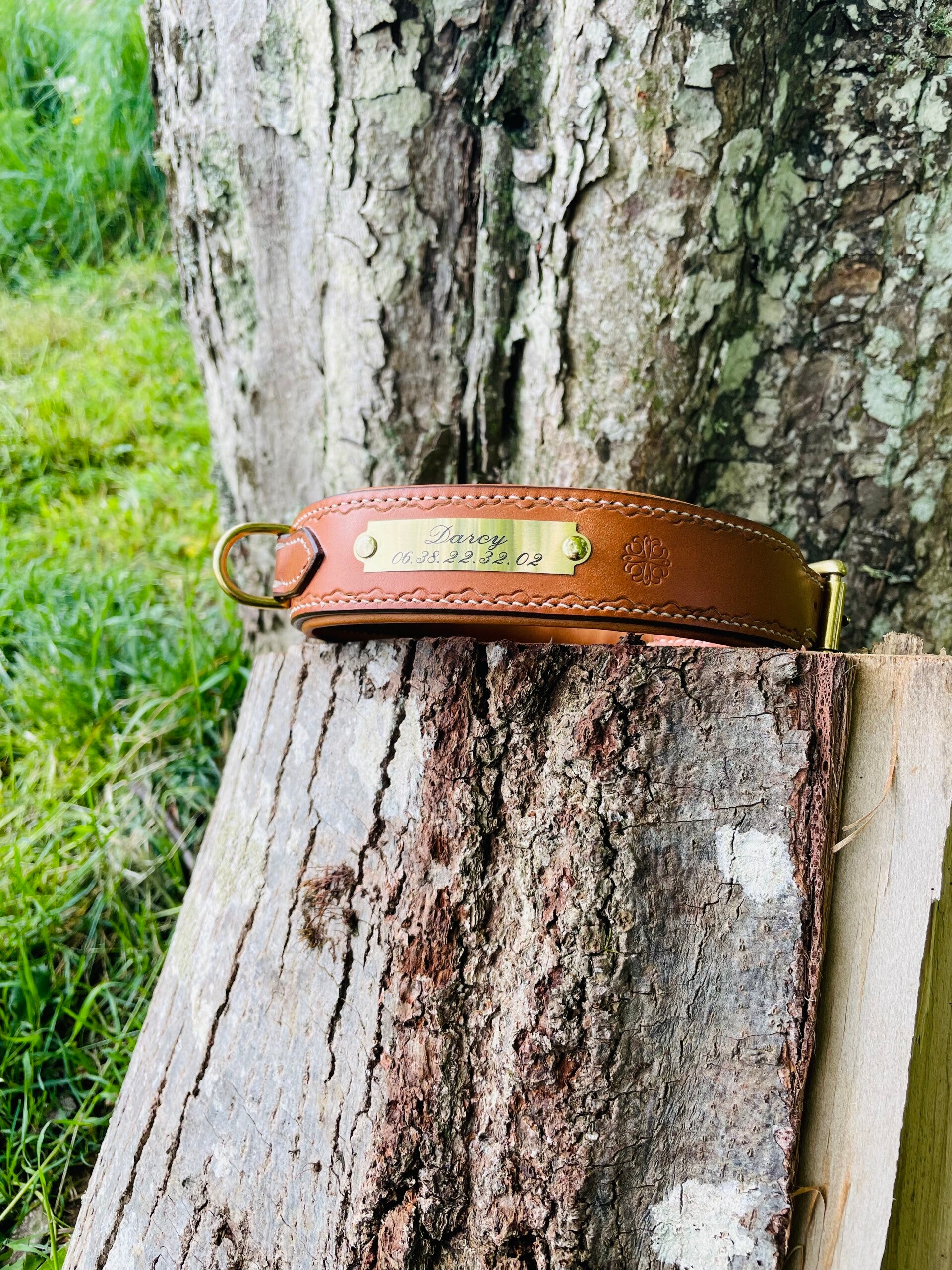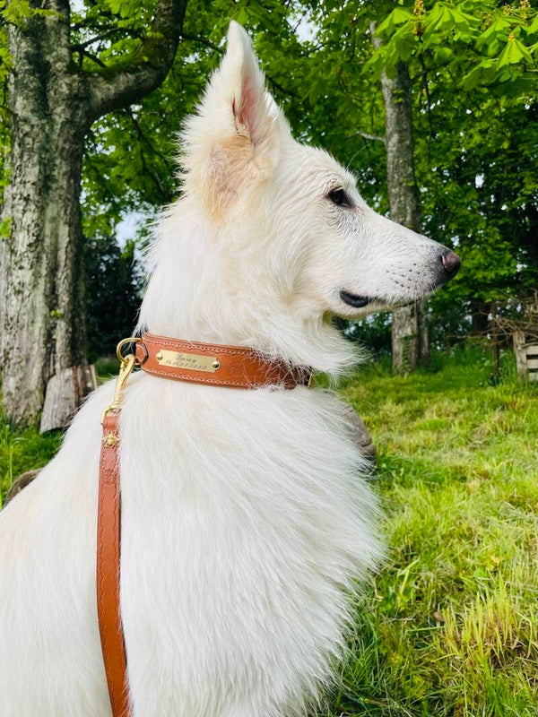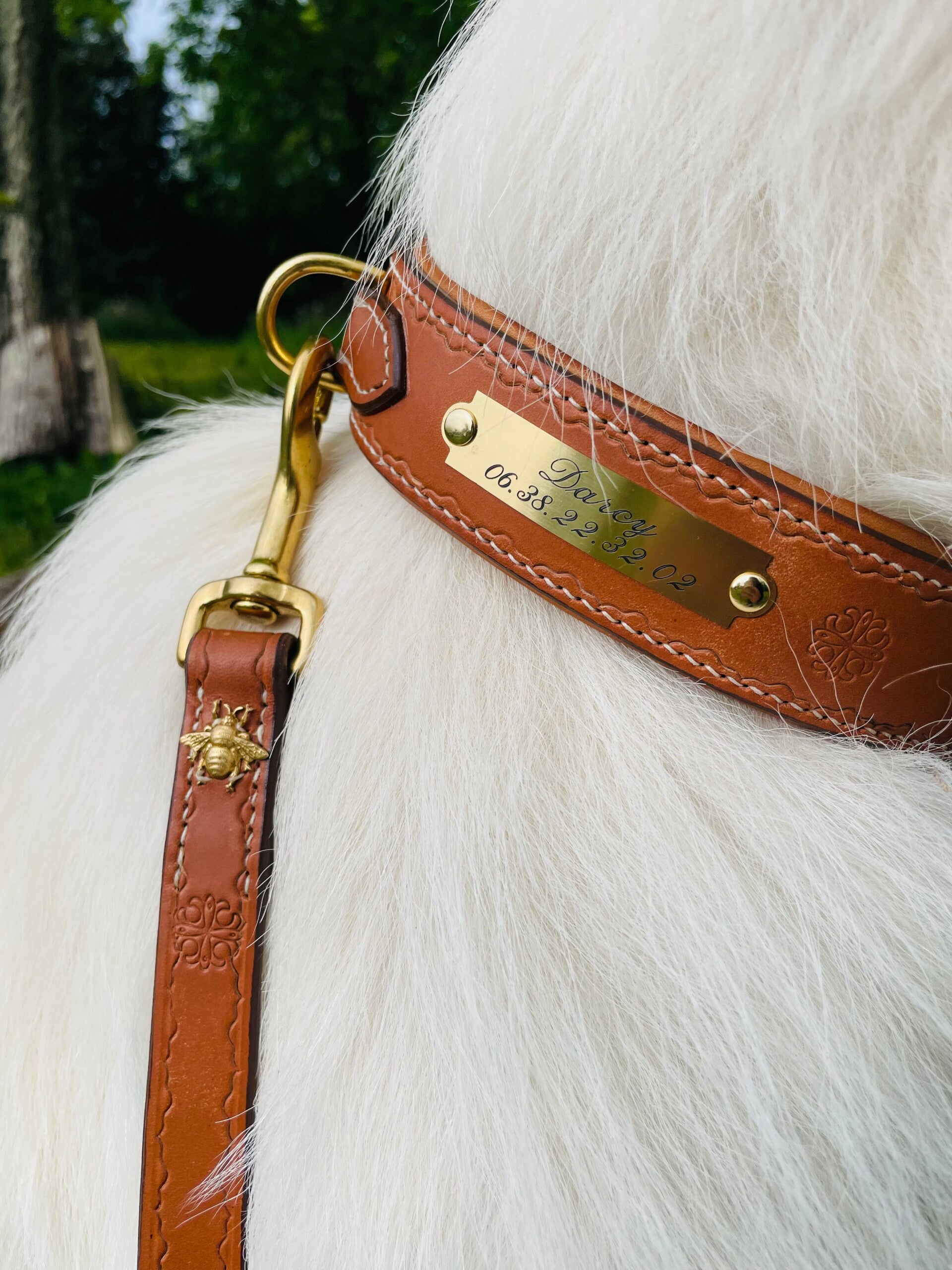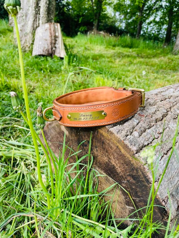 Boucles en laiton. Plaque laiton gravée avec le nom de votre animal et votre numéro. Largeur 35 mm au niveau du cou, 25 mm au niveau des boucles.
