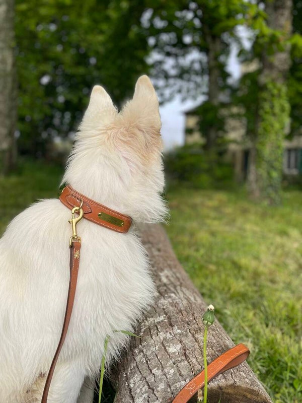 Possibilité de le coupler avec la laisse assortie qui se trouve sur la boutique. Concernant la personnalisation de la plaque, merci de laisser en commentaire lors de la commande ce que vous souhaitez écrire sur la plaque.