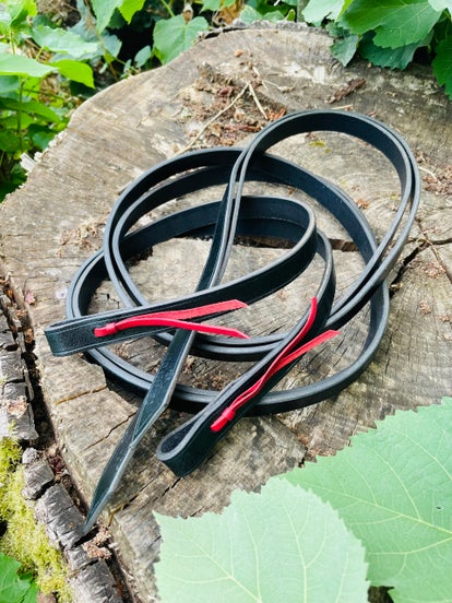 Rênes en cuir pleine fleur à tannage végétal épaisseur 3,5 mm. Rênes ouvertes. 18 mm de large. 2 m de long.